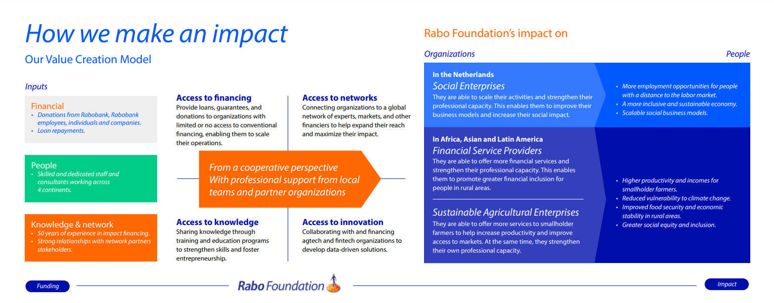 Rabobank Foundation’s value creation model illustrates how funding, expertise, and partnerships help social enterprises, farmers, and financial service providers expand sustainable economic opportunities.